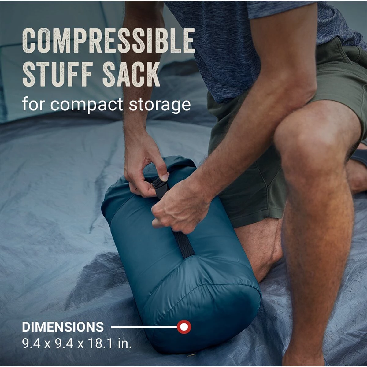 When we’re camping on the weekends or stargazing in the backyard, our 40 Degree Kompact Sleeping Bag keeps us warm and cozy while offering ample space to stretch out or snuggle our pup. Thanks to the draft tube, the zipper doesn’t let cold drafts in, even when there’s a breeze. Since this bag includes a compression sack, we’re able to roll up and move on while easily storing it when we’re done.