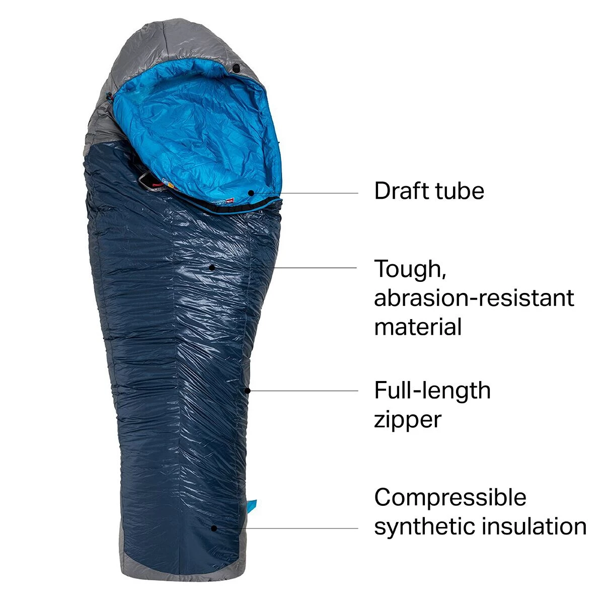 The North Face’s lightest and most compressible synthetic bag for backpacking in damp conditions, the 20 Degree Cat’s Meow Sleeping Bag is a favorite of ours for getting a good night’s sleep in the backcountry. Stuffed with Heatseeker Pro insulation and wrapped around with a Cyclone construction, this bag maximizes our warmth through its compressible, vertical baffles, and maintains a lightweight, compressible design to reduce the weight we’re hauling on our back.