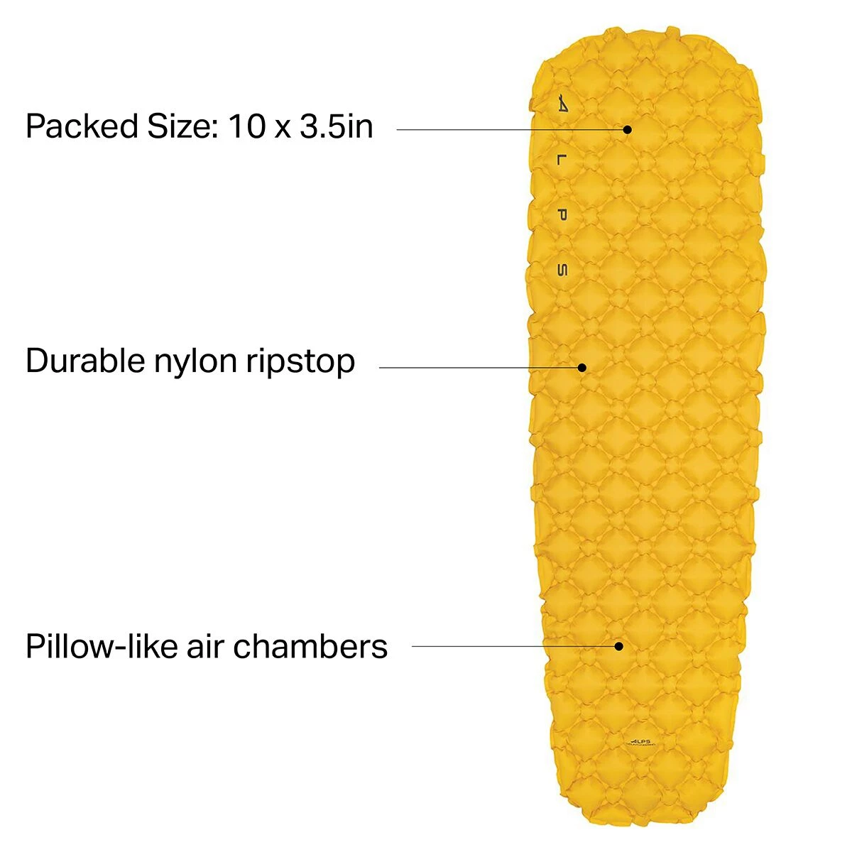 The Alps Mountaineering Nebula Air Mat gives you the comfort and convenience you need to fall asleep faster and stay asleep longer after a long day covering miles on the trail. Perfect for multi-day backpacking missions in warmer climates, this lightweight sleeping pad features small pillow-like air chambers that offer supportive sleep and all-night comfort. The flat inflation/deflation valve makes it quick and easy to inflate, saving you time when you’re setting up and breaking down camp. It’s also made of a tough and durable nylon ripstop fabric that resists abrasion, but if you’re bad enough at choosing campsites to set it down on sharp rocks or a hedgehog, you’ve got an included repair kit that’ll help you mend any punctures or holes so you can keep enjoying calm nights of sleep in the backcountry.